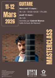 Du mercredi 11 mars 2026 au jeudi 12 mars 2026 Master class guitare Mercredi 11 et 12 mars Animée par Gabriel Bianco
